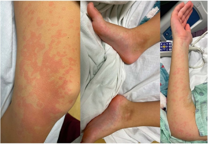 Послеоперационный период сопровождался постоянной лихорадкой, обширной полиморфной макулопапулезной сыпью (рис. 2), инъекцией конъюнктивы и диареей. ПЦР-тесты показали наличие частиц аденовирусов и респираторно-синцитиального вируса.
