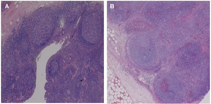 У пациентки был диагностирован мультисистемный воспалительный синдром (MIS-C), связанный с COVID-19, и назначены иммуноглобулины для внутривенного введения в дозе 2 г/кг и эноксапарин. Кортикостероиды и аспирин были исключены (первые – до получения результатов гистологического исследования образования толстой кишки, а второй – до восстановления толстой кишки после операции). Впоследствии гистологическое исследование показало некротизирующий негистиоцитарный лимфаденит (рис. 3). После начала терапии у пациентки уменьшилась выраженность сыпи, улучшилось общее состояние и лабораторные показатели воспаления. Она была выписана через 48 часов после нормализации температуры тела.